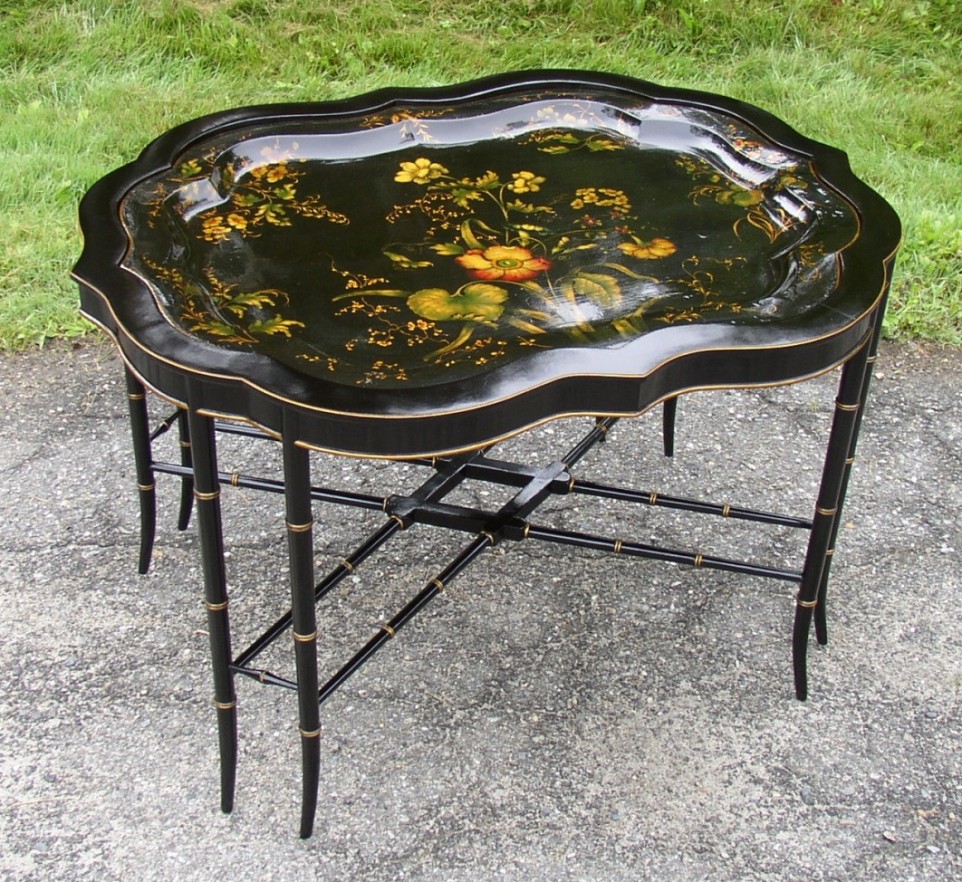 The images below show just a few examples of the many bases I have built to complement antique trays, platters and boxes. Bases are custom fit. Color, sheen, leg and stretcher styles are decided upon after careful consultation with the owner. The results become a new way to display and use beautiful old family treasures.